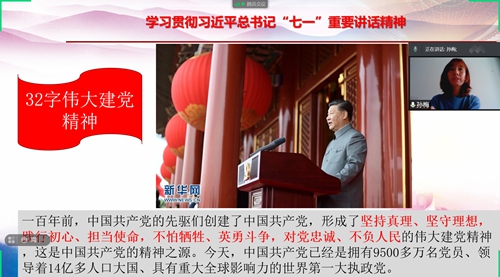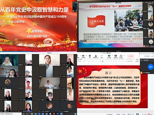 8月10日,教育学院以线上的方式面向教育学院各班级团支书20余人开展了“从百年党史中汲取智慧和力量——学习习近平总书记在庆祝中国共产党成立100周年大会上的讲话”专题学习培训活动。培训中,教育学院辅导员孙梅从“一个主题”“三个伟大光荣”“三个深刻改变”“四个深切怀念”“四个伟大成就”“四个庄严宣告”等方面向学生们传递了习近平总书记“七一”重要讲话精神,并带领同学们一起学习了“坚持真理、坚守理想,践行初心、担当使命,不怕牺牲、英勇斗争,对党忠诚、不负人民”的伟大建党精神及习近平总书记对青年学生的殷切期望。