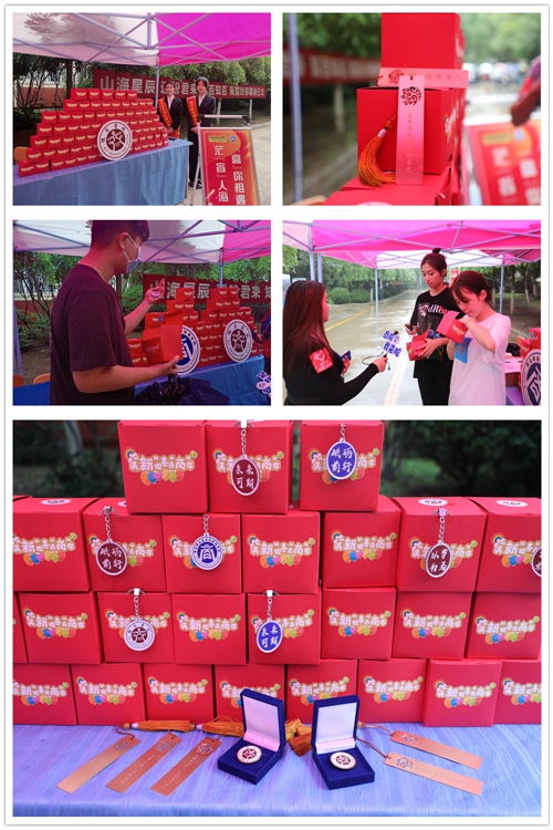 儒商书院在迎新当日还开展了茫“盲”人海,“盒”你相遇主题盲盒活动。前期,儒商书院精心设计定制儒商书院特色书签、特色钥匙扣和特色徽章等文创产品置于盲盒之中,每个文创产品都印有商学院logo、儒商书院logo和励志青春寄语,独一无二的专属盲盒吸引了商学院新生学子的目光,他们纷纷打开盲盒,收获大学生活的第一份惊喜。