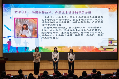艺术学院选拔出的2021级新生辅导员学生助理上台与新生见面,向学弟学妹分享大学生活感悟。艺术学院各专业教研室主任和新生辅导员们分别与新生会面,寄语新生激扬青春梦想,拥抱崭新生活。2020级优秀学生代表赵晋垒发言,分享了大学期间的学习实践经验和成长体悟。随后,新生代表孙凡婷、李虹洁发言,表达了对未来大学生活的憧憬及励志奋进的决心。