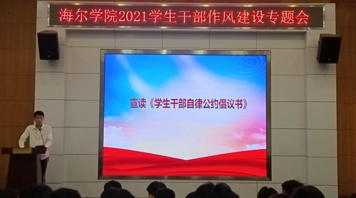 海尔学院学生会主席张庆伟宣读《学生会干部自律公约倡议书》