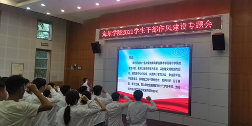 9月7日中午,海尔学院在学校报告厅举行“严作风·倡自律”学生干部作风建设专题会,海尔学院团总支、学生会、社联、楼管会共50余名学生干部参加活动。
