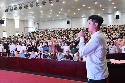 2020级学生生物与化工学院应用化工技术专业秦思雨作为老生代表发言,他从社会实践等多角度分享了自己大学生活的经历和感悟,希望新生能培养良好的自学能力和自我管理能力。2021级新生环境检测技术专业薛源作为新生代表作“不忘初心、奋发有为,做文明有礼青职人”倡议发言并带领全体2021级新生进行“高等学校学生行为准则”宣誓。