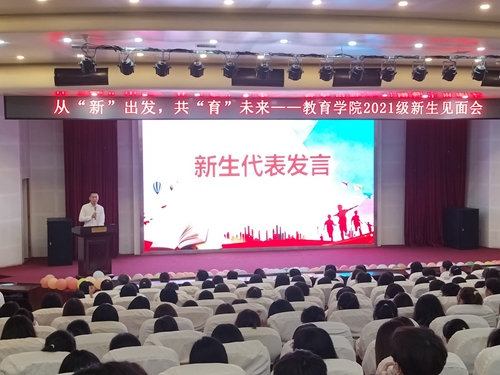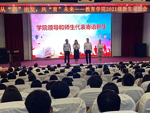 为帮助新生尽快适应新环境,更积极地融入大学生活,9月9日晚上,教育学院在艺术厅开展“从‘新’出发,共‘育’未来”——2021级师生见面会活动。教育学院领导班子、各专业系主任、新生班主任、辅导员、教师代表、老生代表和2021级全体新生参加了此次活动。会议由教育学院党总支副书记贾勇主持。