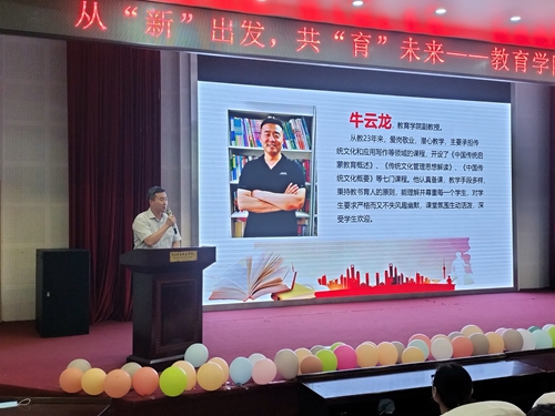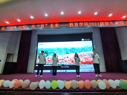 教育学院副院长孙会扬致辞,他代表教育学院对2021级436名新生表示热烈欢迎,他从教育学院的历史沿革、专业设置、师资队伍,建设成果等方面对教育学院进行了介绍,寄语新生脚踏实地奋斗,从“新”出发,及早规划人生,不负青春韶华。随后,教育学院相关负责人和师生代表上台与新生见面,他们表达了对新同学的欢迎,分别介绍了各部门和各专业的基本情况,结合自身经验对同学们的大学学习生活提出了建议。