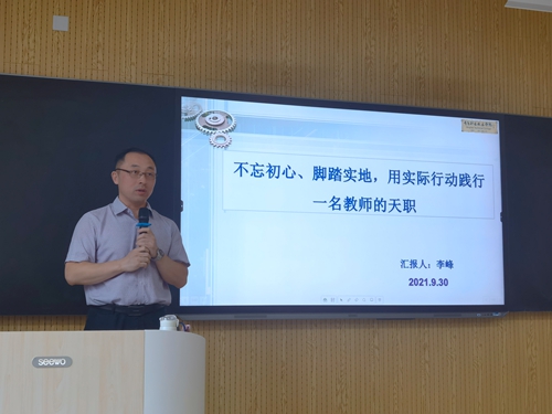 会上,李峰以“脚踏实地,用实际行动践行一名教师的职责”为题,向与会老师分享了自己的成长历程。赵迁远以“课程思政认知”为切入点,从认知、探索、设计、实施、要求等5个方面介绍了自己对于课程思政的理解和经验。她在系统介绍课程思政政策的基础之上,指出课程思政既是为党育人、为国育才的国之大计,也是教师和学生身边的点滴小事;课程思政不是“课程加思政”的简单堆砌,而是“盐溶于水”的育人育才。