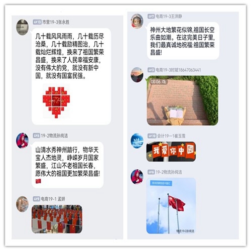 10月1日,商学院党总支组织全体学生开展了“祖国母亲,我想对您说”线上告白祖国母亲活动。活动中,学生纷纷留言,表达了对祖国母亲72周年华诞的美好祝福,字里行间充满了对伟大祖国的热爱与真挚情感,学生立志要将强烈的爱国之情化作实干奋斗的爱国行为,为国家富强、民族复兴贡献自己的青春之力,早日实现我们伟大的中国梦。