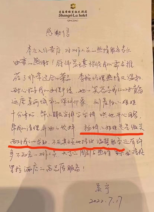 青岛香格里拉大酒店实习生杨琦以优质的服务受到客人表扬
