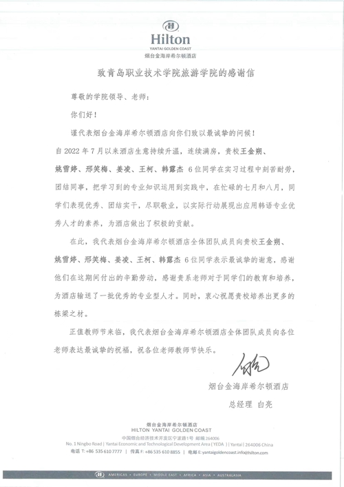来自烟台金海岸希尔顿酒店总经理的感谢信