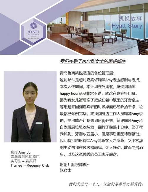 青岛鲁商凯悦酒店对我校实习生鞠萍的表扬信