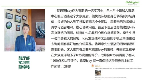 青岛颐中皇冠假日酒店实习生倪晓瑜和张晓燕受到客人表扬