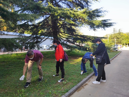 老师们在绿化带捡拾垃圾