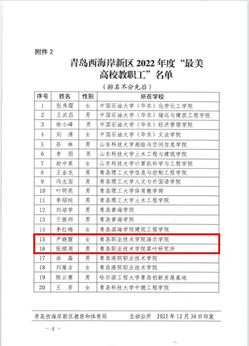 近日,西海岸新区2022年度“最美高校教职工”入选名单公布,来自西海岸新区9所高校的20名最美高校教职工获此殊荣,我校海尔学院制冷与空调技术专业教研室主任、专业带头人尹晓霞教授和旅游学院茶艺与茶文化专业学科带头人张续周教授光荣上榜。