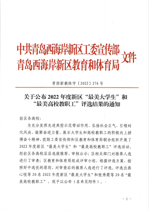 西海岸新区2022年度“最美高校教职工”是由中共青岛西海岸新区工委宣传部、区教育和体育局联合举办,旨在充分发挥先进典型示范引领作用,弘扬社会正气,引领时代风尚,凝聚奋进力量,展现高校教师崇高的道德品质、无私的奉献精神和勇担社会责任的精神风貌。