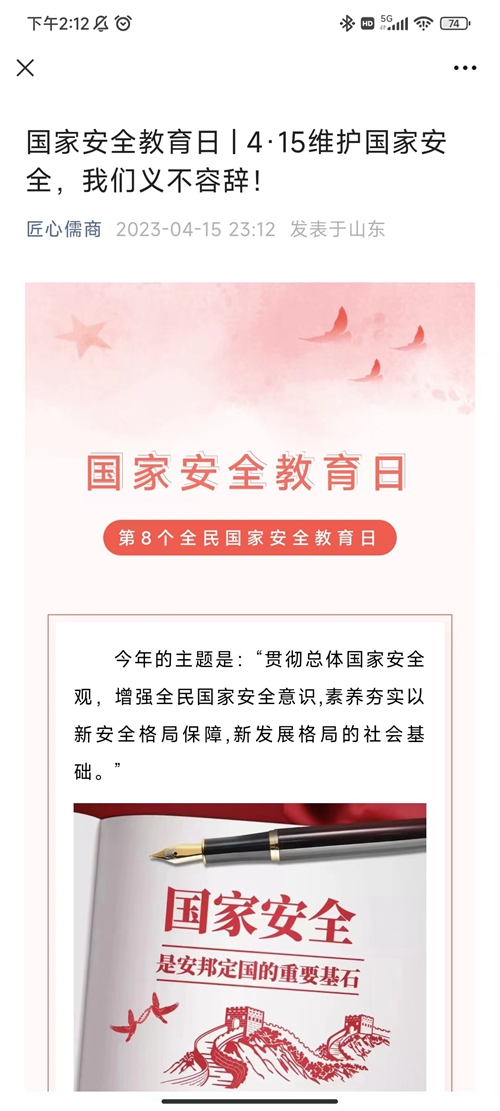 商学院利用黑板报、手抄报、宣传栏、电子屏等多种形式,加强国家安全教育日宣传,营造“国家安全 人人有责”的浓郁校园氛围,引导商学院学子从自身做起,争当保护国家安全卫士,为铸造国家安全的铜墙铁壁贡献青春力量。“匠心儒商”公众号推出“4·15维护国家安全,我们义不容辞”微信推文,围绕“贯彻总体国家安全观,增强全民国家安全意识,夯实以新安全格局保障新发展格局的社会基础”主题,系统介绍国家安全知识,让国家安全观更加深入人心。