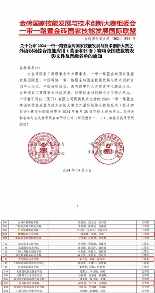 10月13日,2024年一带一路暨金砖国家技能发展与技术创新大赛“外语职场综合技能应用(英语)”赛项公布了全国选拔赛获奖名单,我校选派的三支代表队获得比赛三等奖2项、优秀奖1项。