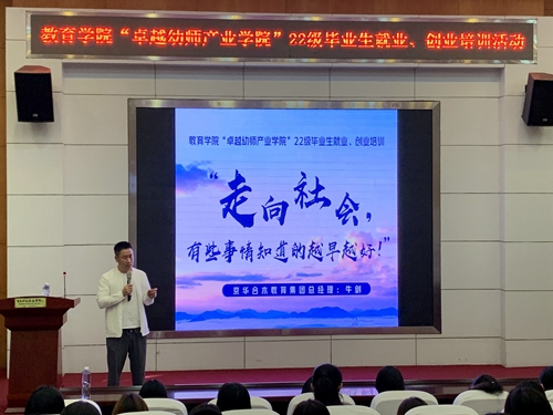 为提升2022级毕业生的就业创业意识与能力,助力学生们实现高质量就业,10月17日上午,教育学院在学校报告厅开展了2025届毕业生就业创业指导讲座活动。活动邀请了京华合木教育集团总经理牛剑担任主讲。教育学院“卓越幼师产业学院”2022级全体学生和学前教育专业毕业生代表参加了讲座。