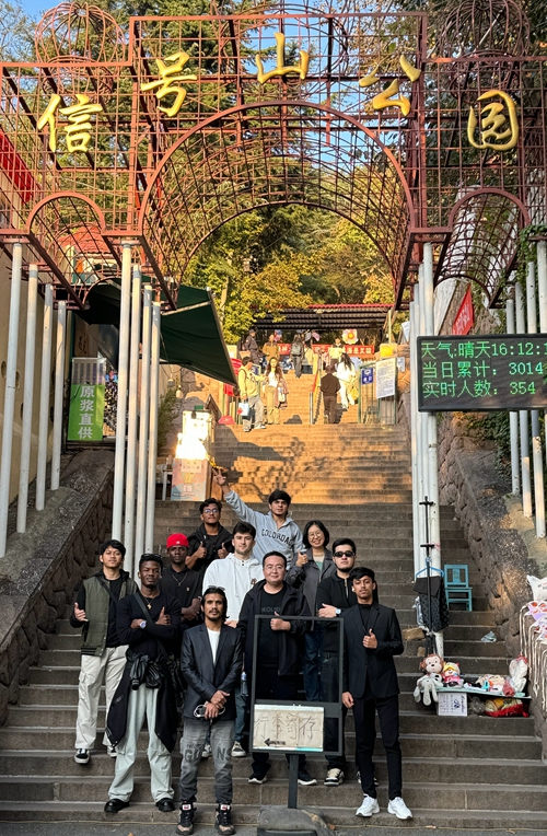 在青岛城市文化学习专题中,国际学生登上信号山公园观景台,俯瞰整个青岛的美景。信号山海拔98米,是青岛市区较高的临海山峰,学生们在这里欣赏到了青岛“红瓦绿树、碧海蓝天”的城市美景,感受了青岛独特的城市风貌。