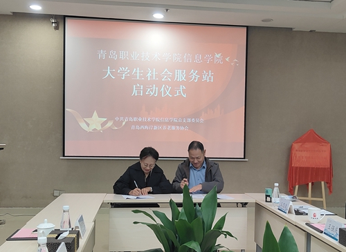 仪式前,与会人员参观了青岛经济技术开发区社会福利中心。仪式上,王强庆对信息学院学生志愿者开展的助老志愿服务表示感谢,并介绍了养老服务协会及中康健康产业发展情况。李明杰就养老服务协会对信息学院助老志愿服务活动的支持表达了谢意。随后,与会人员根据志愿服务供需情况及合作共建事宜进行了座谈。李明杰与王强庆签订了大学生社会实践服务站共建协议,并共同为“青岛职业技术学院信息学院大学生社会实践服务站”揭牌。