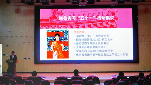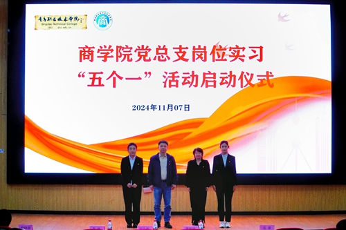 仪式现场,商学院党总支负责人、“双带头人”教师党支部书记代表、2022级学生党员代表、入党积极分子代表共同宣布商学院党总支岗位实习“五个一”活动正式启动。商学院党总支副书记魏敏敏解读了“五个一”活动要求,希望学生党员、入党积极分子强化责任意识,以实际行动砥砺理想信念,践行初心使命。学生党员代表李颖旭宣读“五个一”活动倡议,号召全体学生党员、入党积极分子积极承诺践诺,为学校和实习单位贡献青春与力量。
