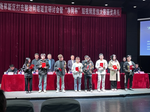 11月8日,西海岸新区打击整治网络谣言研讨会暨“净网杯”短视频原创大赛颁奖典礼在青岛电影学院召开。通过专家打分、网络评比,我校海尔学院学生郑浩哲获得短视频组最佳制作奖银奖,信息学院学生李帅帅获得长视频组最具影响力奖铜奖,旅游学院学生路静、韩佳钧和信息学院学生刘相妤获得优秀奖。