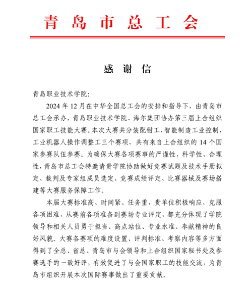 青岛市总工会感谢信