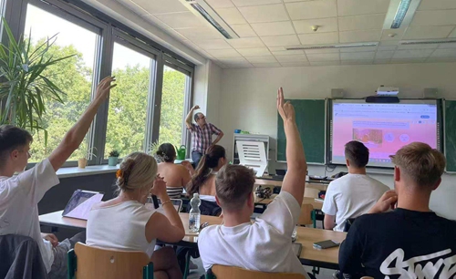 参访期间,福格特兰职业学校副校长Ivonne Milek女士及师生代表热情接待了研修团,并详细介绍了学校办学体系与特色。研修团教师分组进入英语、信息技术、经济、艺术等课堂观摩学习,实地体验“以学生为中心”的教学实践。课堂上,该校教师通过分组讨论、游戏导入、问题驱动、数字资源辅助等教学方法,充分调动学生主动思考与合作学习的积极性,展现了德国职业教育的先进理念与课堂实效。听课后,石磊与该校旅游管理专业“双元制”毕业班学生展开深入交流,学生围绕中国旅游行业发展、实习实践模式及中德文化差异等话题踊跃提问,石磊逐一细致解答。现场气氛热烈友好,在跨文化对话中增进了彼此了解,也有效传播了中国文化和我校旅游管理教育成果。