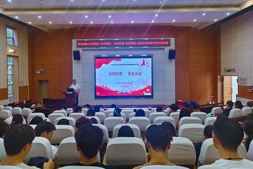 讲座伊始,学生社团“习近平新时代中国特色社会主义思想研学社”学生进行了诗朗诵《山河不会忘记》文艺宣讲。学生们以饱满的情绪和铿锵的语调,再现了那段烽火连天的岁月里中华儿女同仇敌忾、共赴国难的壮丽诗篇,深情讴歌了英雄先辈们的不朽功勋与牺牲精神,瞬间将全场观众的思绪带回到那段波澜壮阔的岁月。