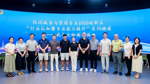 9月16日,旅游学院在闻道楼阶一教室举办“‘休闲行业认知暨专业能力提升’——我与大咖面对面”开学教育活动,这也是“开学第一课”系列新生教育活动之一。彩渱高尔夫俱乐部总经理逍萌、副总经理吴东明,彩渱.TED高尔夫竞技中心创始人杨世强、运营总监姜磊、冠军教练吕晓娟、王牌教练曹金,山东省高尔夫球队主教练高雷,我校旅游学院党总支副书记王耀辉、休闲服务与管理专业教师与2025级全体新生参加了此次活动。