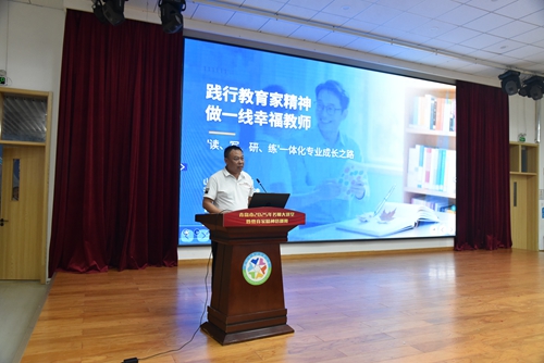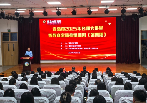 10月17日下午,由青岛市教育局主办,我校承办的青岛市2025年名师大讲堂暨教育家精神培训班(第四期)在胶州市第六实验小学举行,青岛市教育局教师工作处二级调研员张文学,胶州市教育和体育局党组成员、胶州市教师进修学校党总支书记孙甸旭,胶州市第六实验小学校长张淑红,我校培训学院副院长李林鹏出席培训班,胶州市选派青岛市教师思想政治素质提升培训示范班学员、各学校管理干部和骨干教师210余人在主会场参加了此次培训,各学校部分教师在分会场通过“蓝睛客户端”进行线上收看。
