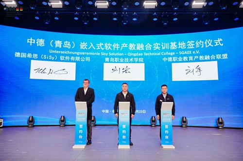 参会期间,刘宏应邀参加了“产教融合与高技能人才培养的最佳实践”高峰对话,代表学校与德国希思(sisy)软件有限公司、中德职业教育产教融合联盟签署了“中德(青岛)嵌入式软件产教融合实训基地”合作协议,孙会扬代表学校接受了“少年工匠学院”及“中德技能大赛合作组织”首批试点培育单位授牌。