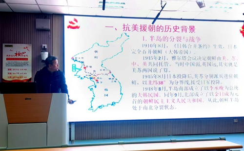 10月29日,在活动第一阶段,教育学院第二党支部书记牛云龙以“正确认识抗美援朝”为主题讲授专题党课。他围绕历史背景、主要战役、客观评价三个问题系统梳理了抗美援朝战争爆发的国际局势与国内处境,阐明了“保家卫国、捍卫和平”的战争正义性;在主要战役讲解中,通过关键战役案例复盘,生动展现了中国人民志愿军“雄赳赳、气昂昂,跨过鸭绿江”的英雄气概与战术智慧;在客观评价部分,从历史意义与时代价值出发,强调抗美援朝战争的胜利捍卫了新中国的安全,极大提升了中国的国际地位,为国家发展赢得了长期和平环境。