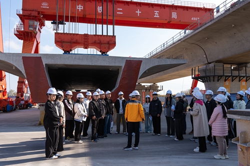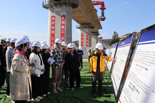 活动中,师生首先参观了潍宿高铁至青岛连接线的黄岛制梁、架梁施工现场,深入了解了山东省高速铁路规划布局、高速铁路建设的先进技术与创新工艺。大家纷纷表示,通过这堂“行走的思政课”深刻感受到了国家基础设施发展的中国速度和磅礴力量,为中国制造和中国智造的突飞猛进而自豪。之后,师生们在展博大厅观看宣传片,对山东高铁建设带动区域经济发展、服务“一带一路”综合交通枢纽有了更全面的理解。