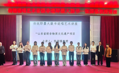 讲座伊始,张国强教授为卓越工匠班的12名即墨大鼓书初级传承人颁发了传承人证书。随后,张国强教授以“即墨大鼓书的保护与传承”为题,从即墨大鼓书的起源、艺术特色及表现形式、主要成果和社会影响、传承与发展等几个方面进行了详细介绍,深刻阐述了非物质文化遗产的传承与创新内涵,并勉励学生们要以传承中华优秀传统文化为己任,自觉做中华优秀传统文化的传播者和创新者。