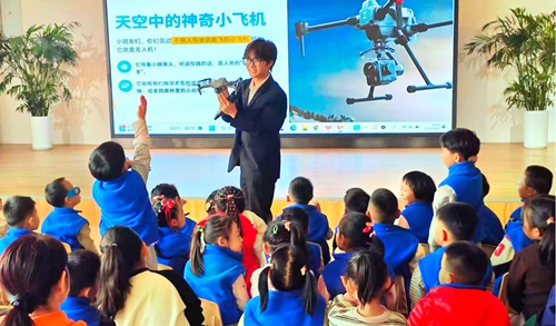 活动中,小讲师们围绕“初识无人机”“无人机怎样飞”“无人机来帮忙”“安全飞行守则”“动手动脑时间”“放飞梦想”六个部分展开讲解。通过形象生动的比喻,将无人机比作“空中小助手”,将螺旋桨比作“四只小手”,激发了孩子们浓厚的兴趣。小朋友们认真听讲,积极互动,在轻松愉快的氛围中了解了无人机的种类、飞行原理及其在生活中的广泛应用。此外,课堂还设置了无人机放飞环节,让孩子们在实践中感受飞行的乐趣与科学的魅力。小讲师们还引导孩子们畅想“未来的无人机”,鼓励他们大胆想象、勇敢表达,在心底埋下科技创新的种子。