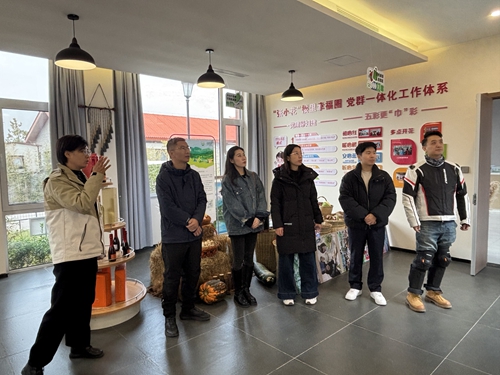 沙龙活动结束后,全体成员在张家楼街道相关负责人的陪同下前往画美达尼乡村振兴片区进行实践研学,参观了当地特色农产品展台和文旅专区,进一步了解共建单位在现代农业和文旅产业方面取得的最新成果,共同探讨从农创品牌打造、乡村景观设计、数字技术推广乡村旅游等方面以专业赋能乡村振兴建设的实践思考。