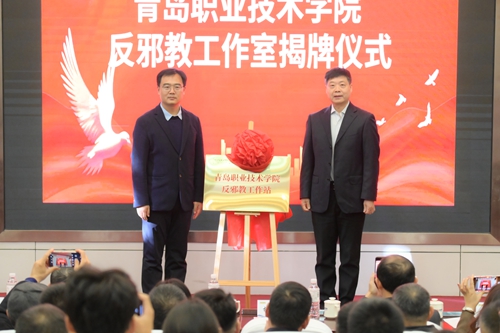 市科协党组成员、副主席柳本才在致辞中指出,反邪教工作事关国家安全与民生福祉,全市各级反邪组织要充分发挥科普宣传与基层治理优势,创新宣传方式,尤其要发挥青年志愿者的生力军作用,推动反邪教育实现全覆盖、常态化。他强调,要深化校地联动,引导广大青年树立科学精神,共建反邪良好氛围。我校党委委员、统战部长田秀丽在致辞中表示,高校是防范抵御邪教的关键阵地,我校始终将反邪教宣传教育融入校园建设各环节,注重发挥青年群体的主体作用,持续营造崇尚科学、远离邪教的校园环境。学校将以此次活动为契机,持续深化反邪教工作,筑牢校园思想防线。随后,柳本才为2025年青岛市反邪教先进集体颁发荣誉证书,并与我校旅游学院党总支副书记王耀辉共同为学校反邪教工作室揭牌。