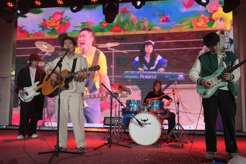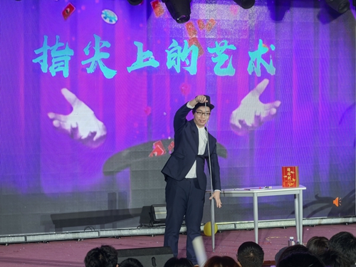 晚会在活力四射的开场舞中拉开了帷幕,按照“初见·邂逅青春”“同行·燃动韶华”“同心·共赴新程”三个篇章徐徐展开。陶笛演奏配合双人合唱的《烟雨行舟》兼具古典韵味与青春活力,乐器合奏《都选c》实现了器乐与声乐联动,蕴含流行元素的歌曲《baggy jeans》与彰显红色基因的朗诵《不朽》兼顾了多元审美与意义升华。光影剧《遇见》、魔术《指尖上的艺术》为观众带来了新颖的视听体验,心理情景剧《校园不容欺》批评了校园霸凌现象。师生互动趣味游戏拉近了彼此距离,将晚会推向高潮。活动最后,全体学生合唱《我爱你,中国》,进一步凝聚了学生的向心力,强化了家国情怀。