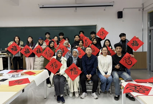 活动现场,11位留学生依次分享了在学校的学习及生活体验,言语间满是收获与自豪。书法课教师匡万利带领留学生们从握笔姿势到沾墨再到书写逐一示范,留学生们执笔蘸墨,一笔一划在红纸上临摹“福”字。随后,匡万利示范指导剪纸技巧,在志愿者的帮助下,留学生们从对折、画样到裁剪专注创作,当红纸展开变成寓意吉祥的窗花时,现场响起阵阵惊叹。活动最后,全体参与者手持作品合影留念。