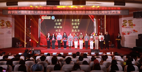 晚会中场举行了2025级班导师聘任仪式,为12位专业导师颁发了聘书,以此感谢教师们为书院教育工作付出的辛勤努力,同时勉励各位教师深耕本职、履职尽责,为商学院学子的成长成才提供更优质的指导与服务。同时集体表彰了2025年商学院在专业学习、技能竞赛、学生工作等方面涌现出的优秀学生代表,鼓励儒商学子们向朋辈榜样学习看齐,共同进步。