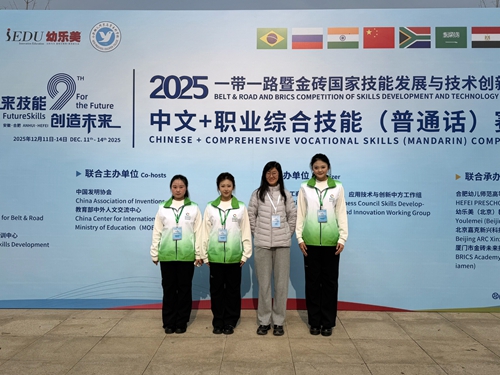 12月11日至14日,2025“一带一路”暨金砖国家技能发展与技术创新大赛中文+职业综合技能(普通话)赛项全国总决赛在合肥举办。经过激烈角逐,我校教育学院学生董婧琦、邹欣、宋钰脱颖而出,荣获高校组三等奖。