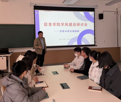 12月23日下午,信息学院在修能楼106会议室召开学风建设专题研讨会。信息学院党总支副书记李海民、各年级辅导员参会,聚焦学情分析和实战演练,共谋学风提升路径。