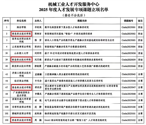 近日,机械工业人才开发服务中心公布《2025年度人才发展专项课题立项名单》,我校申报的4项课题全部成功入选。其中,陈柄言主持的《智能制造实训基地“智能+”升级改造路径探索》与刘月娟主持的《新质生产力驱动下高职院校专创融通的课程体系重构研究》获重点资助;邵世芬主持的《职业教育专业群设置与产业集群协同发展动态适配机制研究——以青岛智能家电专业群为例》与周楠主持的《GenAI驱动的智能制造专业群“数智工匠”人才培养实践研究》获自筹项目。
