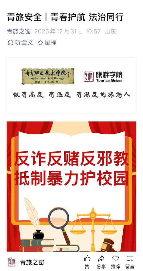 活动前期,旅游学院依托官方微信公众号青旅之窗推出“青春护航 法治同行”专题宣传,开设“法治进校园”专栏,聚焦《中华人民共和国宪法》《中华人民共和国未成年人保护法》《中华人民共和国预防未成年人犯罪法》等核心法律法规,与反诈、反赌、反邪教、抵制校园暴力等现实安全议题相融合,制作发布普法图文、主题海报等内容,其中“反诈反赌反邪教 抵制暴力护校园”系列视觉宣传内容引发师生广泛关注,以生动直观的方式为师生普及法律知识,为系列活动预热。