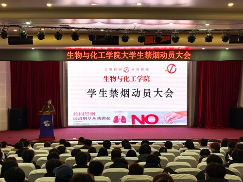 为加强文明校园建设,筑牢校园安全防线,1月8日下午,生物与化工学院(知行书院)在学校艺术厅召开学生禁烟动员大会。生物与化工学院党总支副书记苏娟、全体辅导员、全体学生干部及吸烟学生代表共300余人参加了会议。