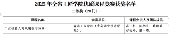 近日,由省总工会、省教育厅、山东管理学院联合举办的2025年全省工匠学院优质课程竞赛获奖名单公布,由青岛工匠学院(青岛职业技术学院)海尔学院提报的《工业机器人离线编程与仿真》课程获二等奖。