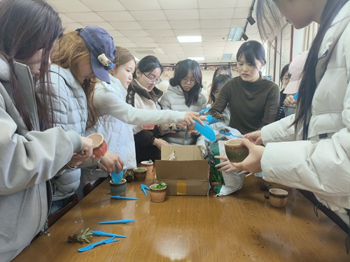 活动伊始,学校基建处园艺师潘庆杰结合校园丰富的植物资源,为大家带来一堂生动的“识绿”植物生态“大思政课”。从梅花的物候特征到水杉的生态价值,从草坪节水技巧到灌木修剪知识,让大家深入了解了每一种植物的脾性与作用,理解了思政课中学到的保护生物多样性的重要意义。随后,师生拿起铁锹、水桶等工具投入到“护绿”志愿服务中。大家分工协作,在辛勤劳作和积极护绿的“大思政课”实践中理解“习近平生态文明思想”的深刻内涵,体悟劳动价值和“奉献、友爱、互助、进步”的志愿服务精神。同学们纷纷表示,要争做生态文明理念的传播者、践行者,让绿色成为青春最亮丽的底色。同学们还来到图书馆,参加了多肉植物的“植绿”体验活动。