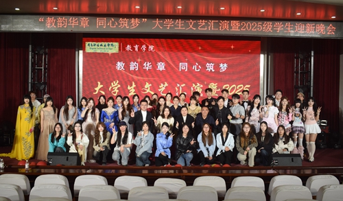 为丰富校园文化生活,展现教育学院学子的青春风采与专业素养,3月30日晚,教育学院在艺术厅举办“教韵华章 同心筑梦”大学生文艺汇演暨2025级学生迎新晚会,教育学院班子成员、相关教师及400余名学生共同观看演出。