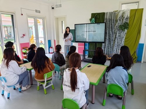 活动伊始,在平度康贝托育中心相关负责人的引导下,教育学院师生一行参观了新建园所的多功能活动室、婴幼儿照护室、户外活动场地、餐饮配备区等各类办学设施与功能区域。负责人结合托育中心的办学理念、日常运营管理、婴幼儿照护服务规范等内容,进行了全方位讲解,师生们近距离感受了专业托育机构的教学环境、服务流程与育人氛围,对托育行业的实际工作场景有了更为直观、清晰的认知,进一步加深了对托育专业职业内涵的理解。