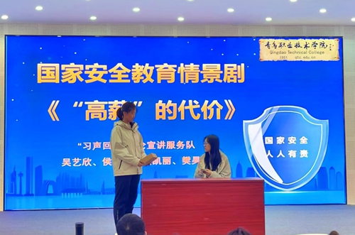 本次课堂以“情景短剧+专家讲座”的形式展开。上课伊始,来自习近平新时代中国特色社会主义思想学研社、青马课堂等社团骨干组成的“习声回响”学生宣讲服务队队员带来了一场生动的情景短剧《“高薪”的代价》。同学们围绕日常学习生活中可能涉及国家安全的典型场景进行艺术化呈现,沉浸式的编排设计与惟妙惟肖的真情表演,将国家安全无小事的理念贯穿始终。随后,青岛西海岸新区国家安全局专家以“隐蔽敌情与应对策略”为题,结合当前国内外安全形势,通过一个个真实案例分析了危害国家安全行为的常见类型与识别方法,并就青年学生如何在日常学习生活中维护国家安全提出了具体建议。全体师生认真聆听、深受教育与启发。