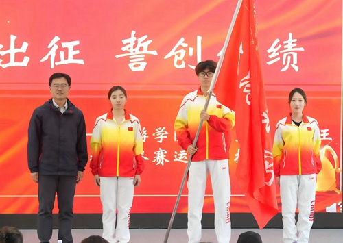 旅游学院党总支副书记王耀辉为运动会参赛队员授旗